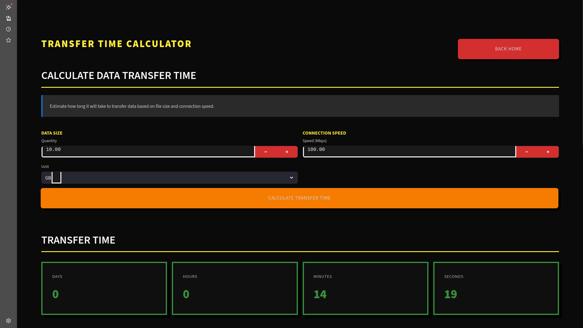 Transfer duration is calculated directly at the bit level. Data is converted into bits, bandwidth is converted from Mbit to bits, and total time is calculated in seconds. The result is then broken down into days, hours, minutes, and seconds. It does not rely on approximations — it performs direct mathematical computation.